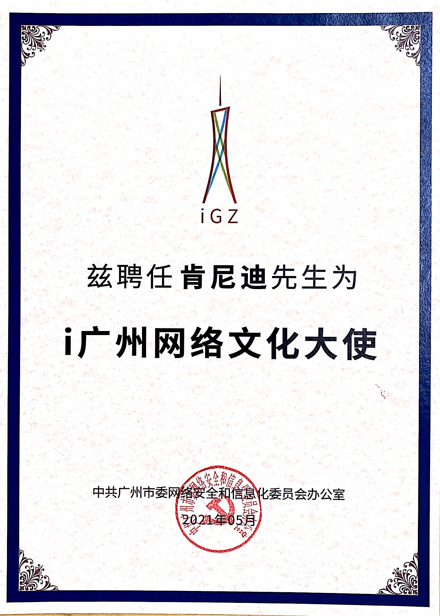 2021年5月,肯尼迪被中共廣州市委網(wǎng)信辦授予“i廣州網(wǎng)絡(luò)文化大使”,向全世界講述廣州故事、傳播嶺南文化風(fēng)采,用網(wǎng)絡(luò)傳遞美好。