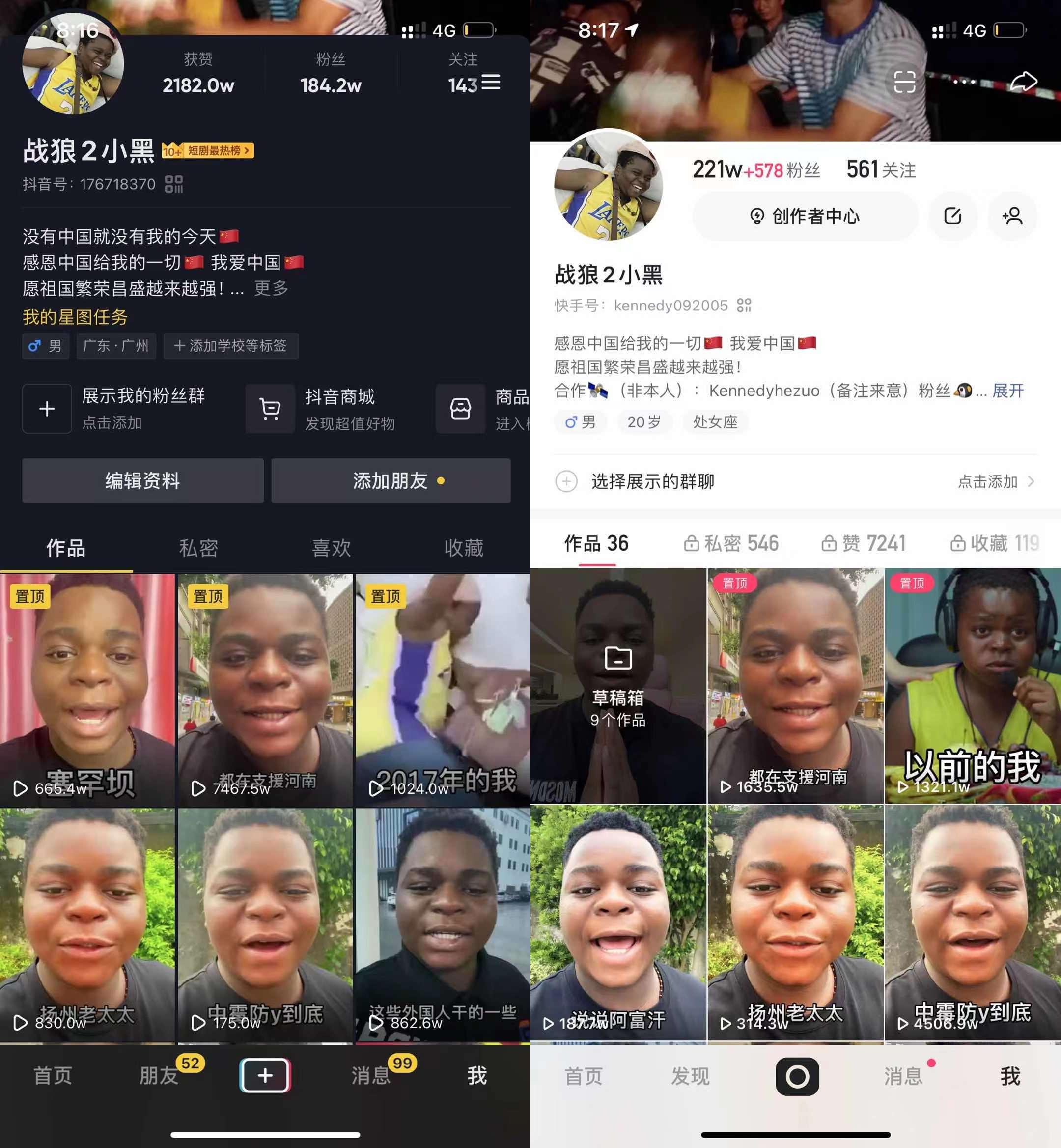 肯尼迪的另一個身份就是一個網(wǎng)紅主播,在抖音和快手平臺分別有180萬和220萬粉絲。近期肯尼迪拍的幾條反映中國抗疫、中國奧運(yùn)健兒以及河南暴雨救援的視頻均獲得全網(wǎng)網(wǎng)友點(diǎn)贊,多次登上各大平臺熱搜榜,點(diǎn)贊量破百萬、視頻播放量破億。