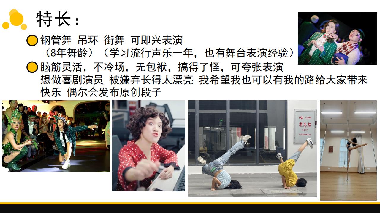 特長:鋼管舞 吊環 街舞 軟功