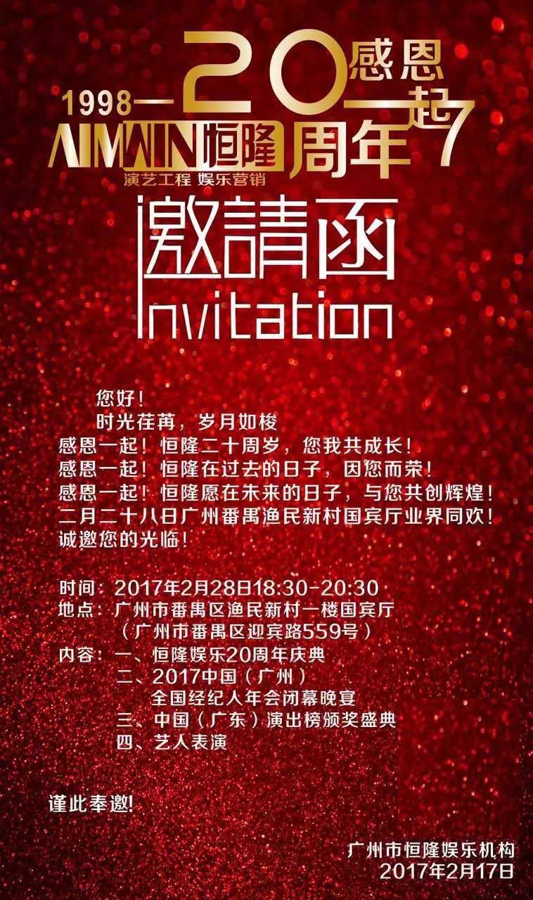 本次恒隆娛樂機構二十周年年會慶典將在廣州番禺區迎賓路559號漁民新村揭開帷幕,同時2017中國(廣州)全國經紀人年會閉幕晚宴也將同時舉辦。