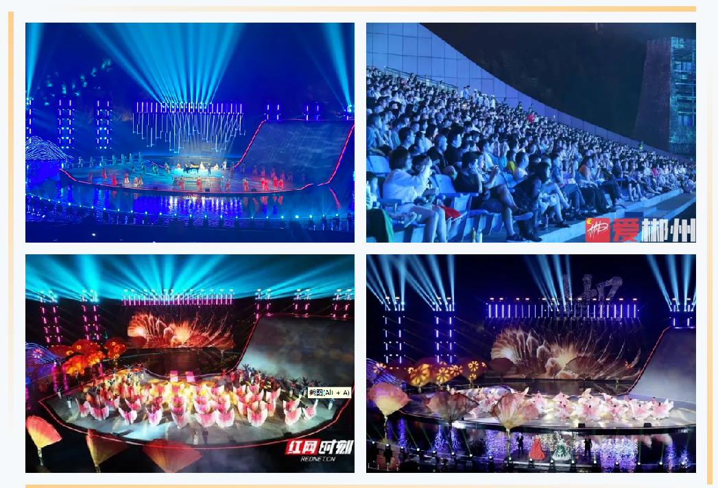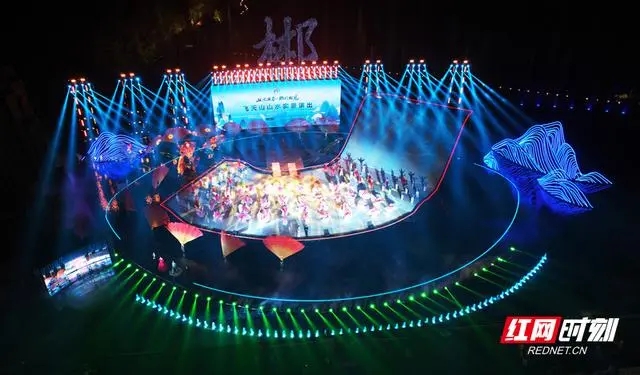 2023年10月1日-3日,飛天山山水實景演藝在飛天山演藝中心上演,場場爆滿,吸引了6000余名游客觀看。《飛天山·山水實景演藝》通過三個篇幅的內容將郴州的人文特色、非遺文化、融入山水畫卷之中。演出運用燈光、音樂、4D影像等為游客們秀出了特別的視覺盛宴。